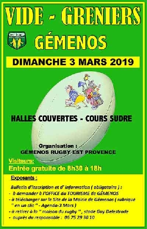 Halle des arcades Cours Sudre Gémenos 13420 ![]() Bulletin d'inscription obligatoire, disponible : - site de la mairie de Gémenos (agenda) office de tourisme - envoi par l'organisateur (courriel ou courrier postal) Installation exposants à partir de 6h, placement par les organisateurs. Fin à 18h30. Les emplacements sont couverts (halles couvertes), possibilité si beau temps de s'installer en face, en extérieur sur la placette de la poste. Tarif exposants : 7€ le mètre linéaire ; 3m MINIMUM autorisés et plus (soit 21€ minimum). Règlement et informations sur le bulletin d'inscription. Tous les emplacements sont sur du dur ( pavés ou revêtement) . WC gratuits. Les emplacements sont situés sur la route de la Ste Baume et en face l'église. Toutes les informations sont inscrites sur le BULLETIN D'INSCRIPTION Dernier délai pour s'inscrire : MERCREDI 27 FÉVRIER. Bulletin d'inscription et d'information à télécharger ICI |